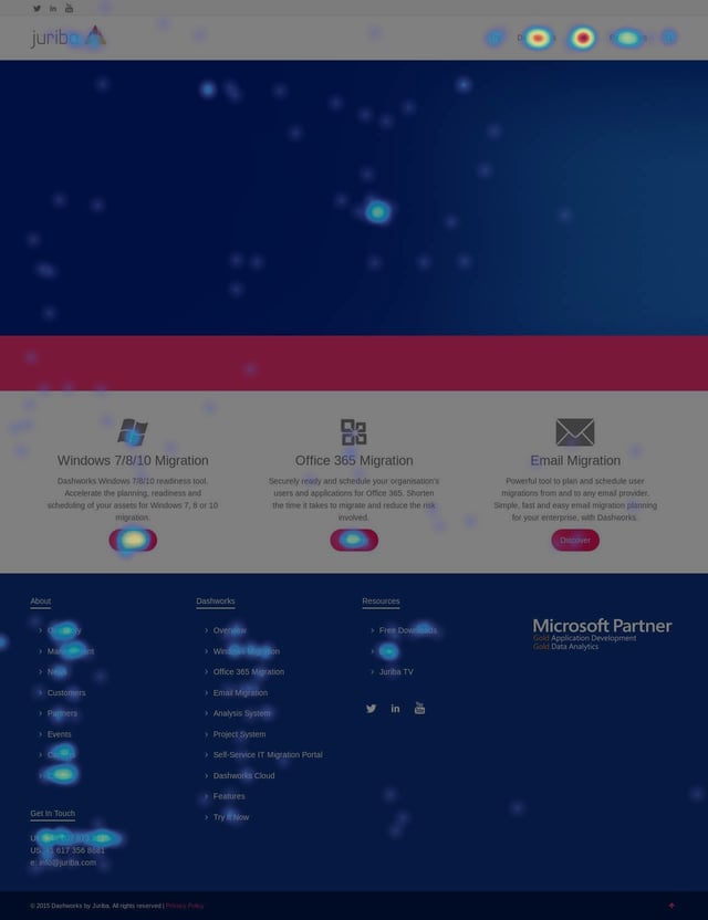 Other elements on the homepage were not very successful either. The hero image was static and not clickable — but visitors still tried to expecting to get somewhere. Below the image were the sections introducing the three main use cases for Dashworks: Windows 7/8/10, Office 365 and Email Migration. However, the Windows 7/8/10 button as the most popular one received less than 6% clicks.