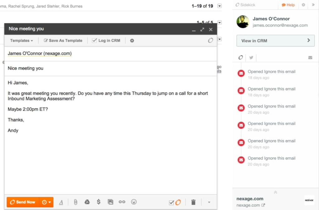 If a sales person writes an email (in Google Apps for Business or Gmail, Outlook integration is planned at some point but not in active development yet) to a prospect and types in the email address, Sidekick checks if this person is a contact in HubSpot already. If the answer is yes, the app will pull the contacts timeline and related information.